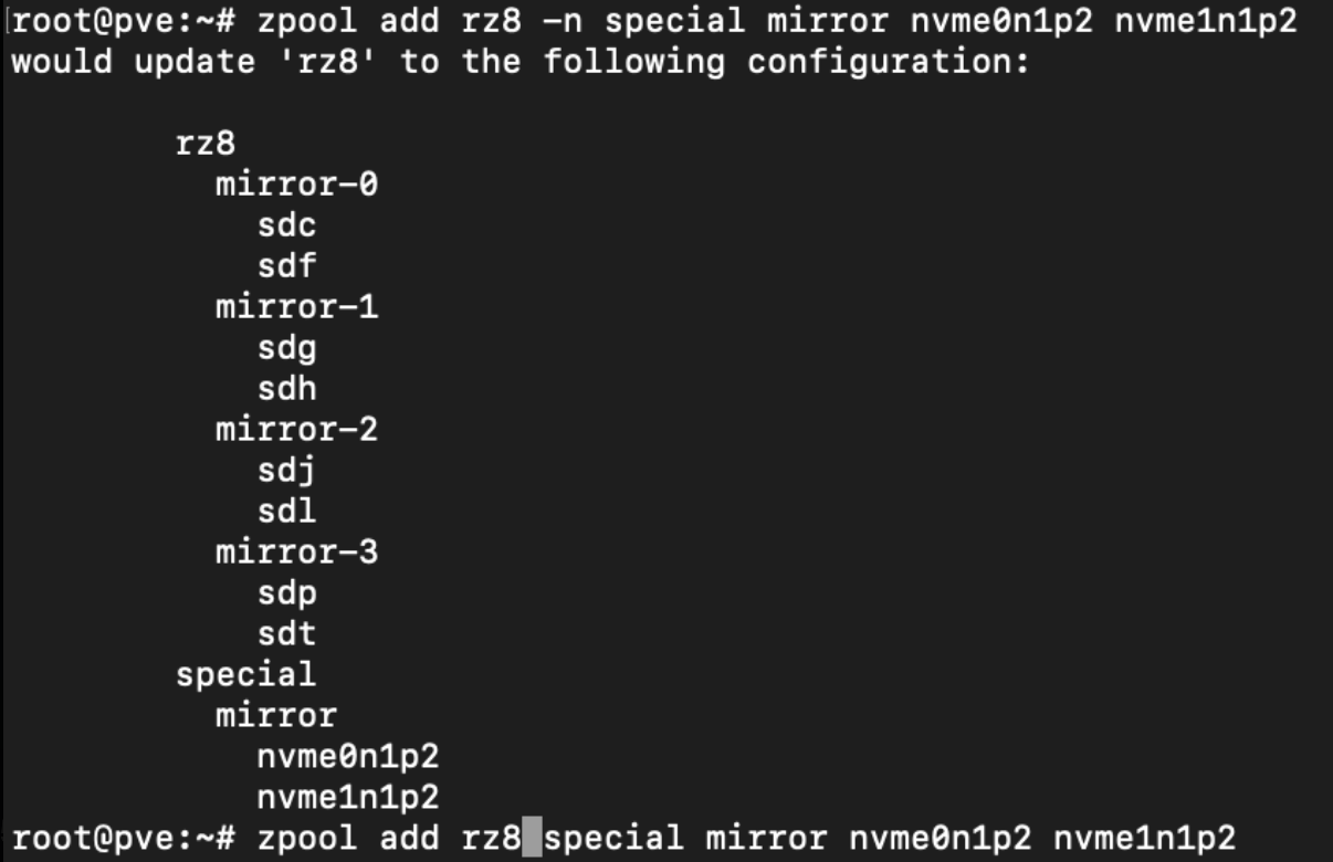 Mit dem Parameter zpool create -n bekommt man als dry-run erst mal eine Vorschau!