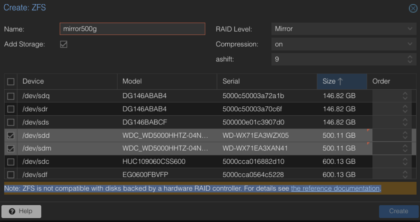 Nach der Anlage eines Raid mit ProxmoxVE empfiehlt sich die Basis nicht wie hier auf mirror500g zu setzen, sondern die zu erwartenden Dateisysteme und Volumes zu strukturieren und dann dort den Proxmox Storage zu definieren