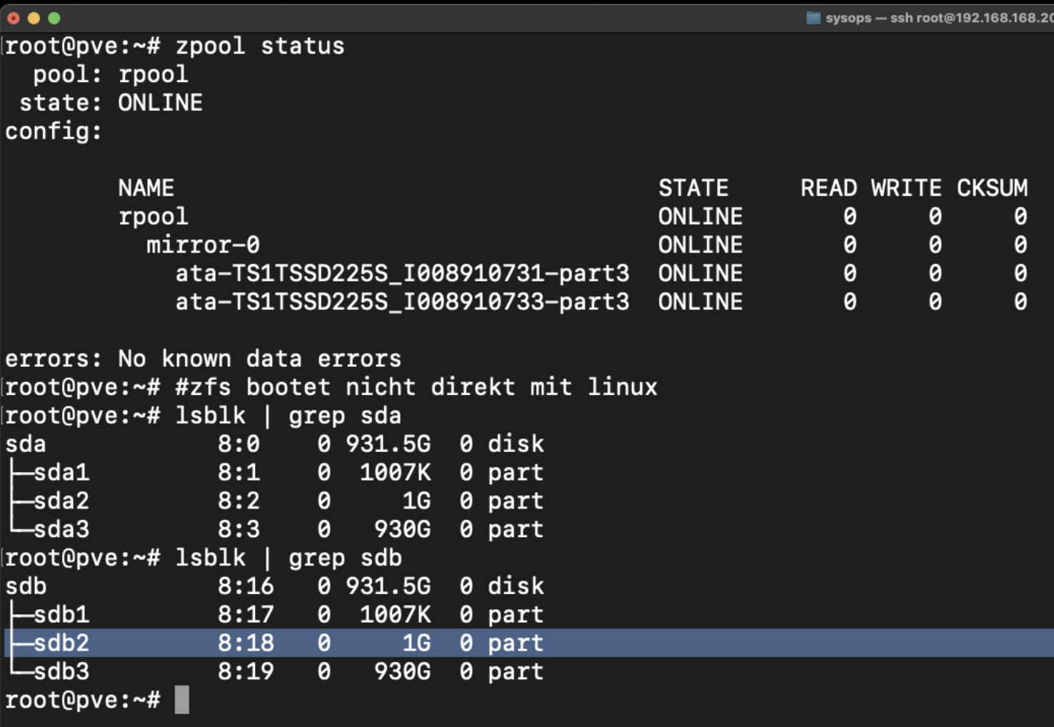Daher ist zu beachten daß immer genügend Bootdisks mit einem dreiteiligen Partitionslayout vorhanden sind. Würde man im Laufe der Zeit die beiden dritten Partitionen gegen komplette Disks ersetzen, wäre nichts mehr zum für den Systemstart vorhanden. Bei Proxmox VE übernimmt diesen Teil das Tool proxmox-boot-tool (format/init/status) der auf die zweite Partition angewendet wird. Die erste Partition enthält noch Grub für Bios Boot, die Dritte dann das eigentliche ZFS mit Proxmox VE.Hierzu empfehle ich unsere Kursreihe Proxmox Produktiv mit ZFS betreiben!