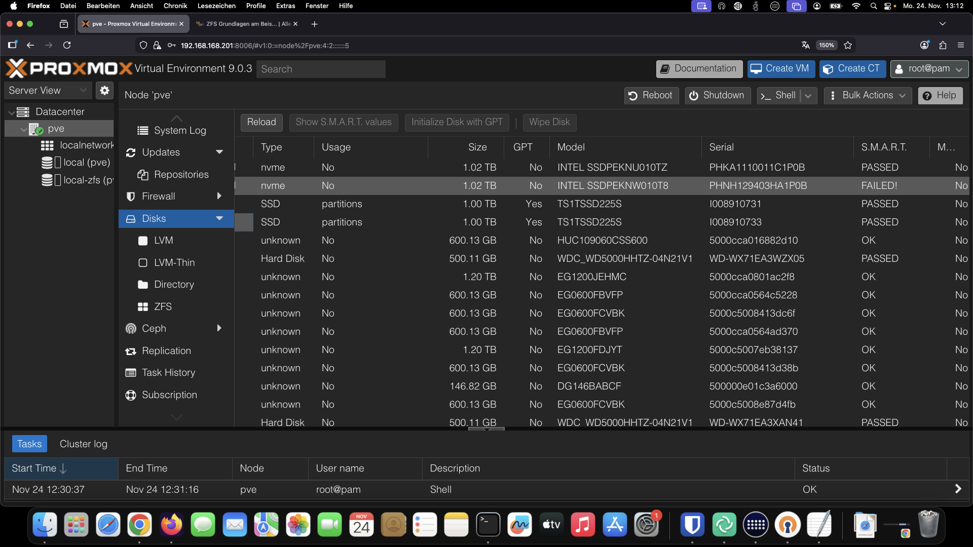Im aktuellen Kurs verwenden wir einen älteren Supermicro Server mit 24 Einschüben plus zwei NVMe, damit wir alles abbilden können. Die Verwendung bereits benutzter Disks, die teilweise nicht getestet wurden, wird bald die Notwendigkeit von ZFS bestätigen! Die NVMe sind nach ca zwei bis drei Jahren Cachebetrieb schon am Ende ihrer Laufleistung!