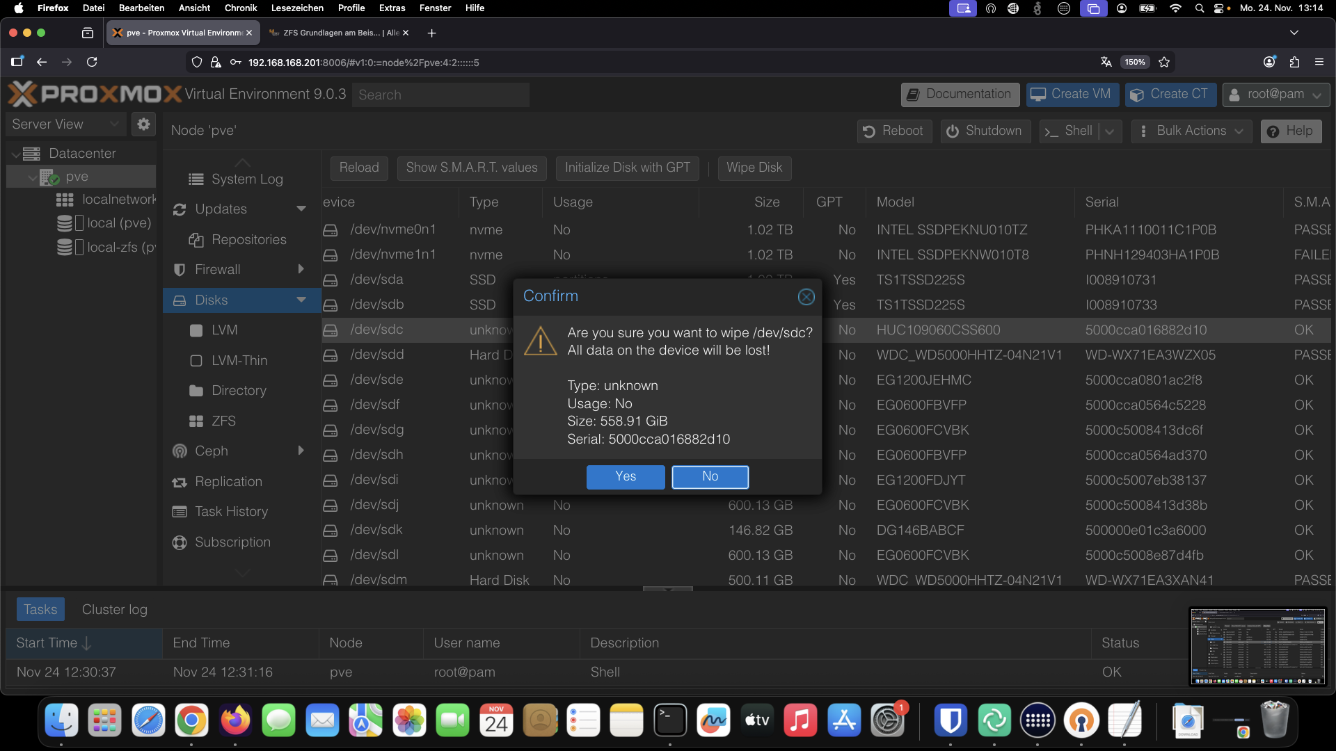 Sollten sich dennoch Daten auf Ihren Datenträgern befinden taugt die Wipe Funktion in PVE gut zur Wiederinbetriebnahme belegter Disks, es sei denn es war etwas mit LVM oder CepH auf den Disks.