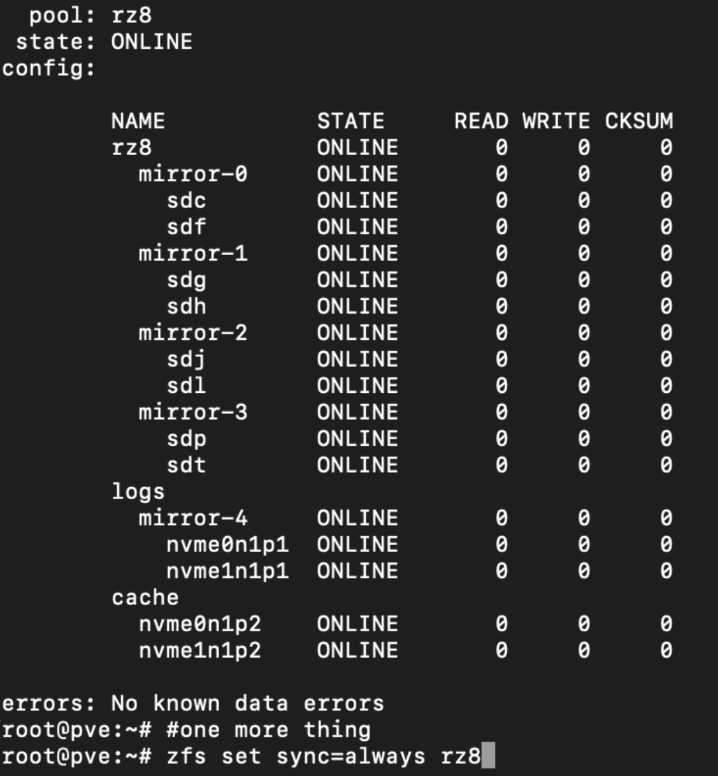 Logdevice (Writecache muss gespiegelt werden)Damit der Log auch genutzt wird muss man noch mit zfs set sync den cache aktivieren